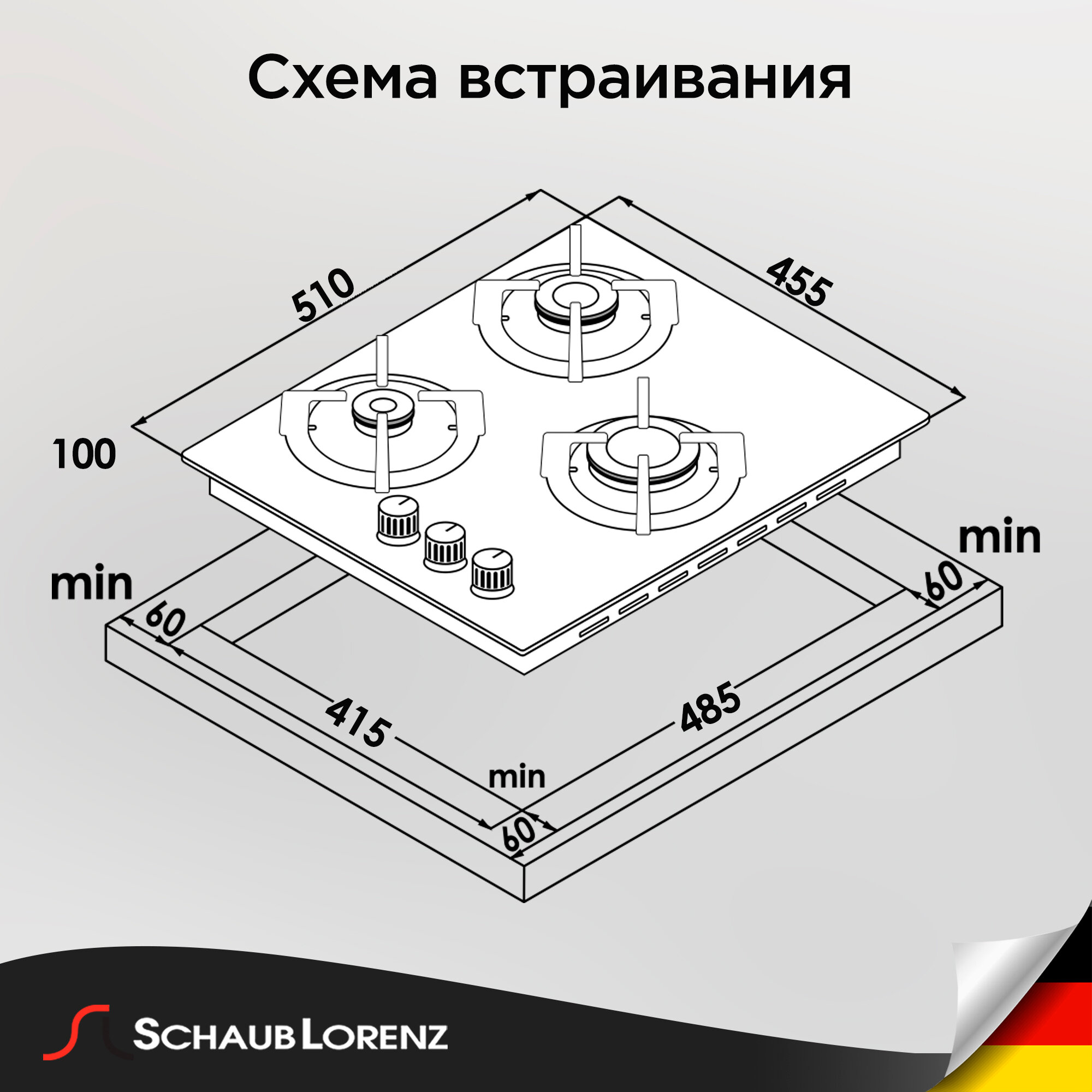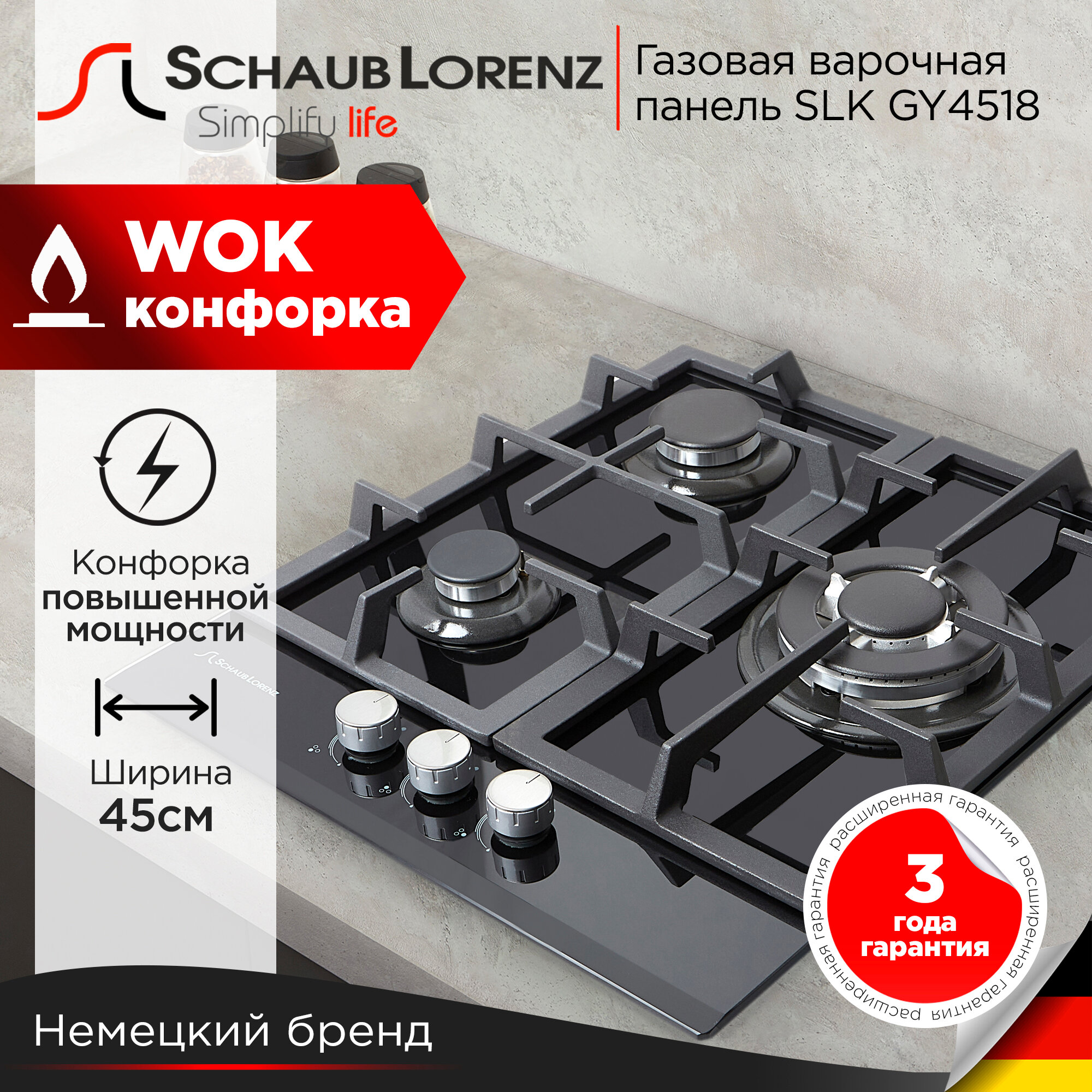 Газовая встраиваемая варочная панель Schaub Lorenz SLK GY4518, 45 см, черный, закаленное стекло, WOK интересное: