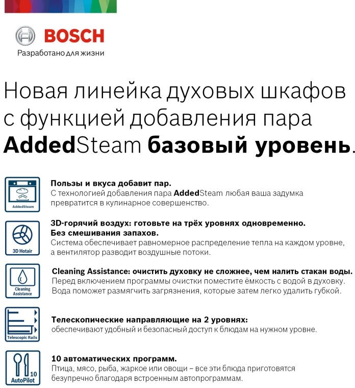| Дополнительная информация | SoftClose плавное и бесшумное закрытие дверцы; удобный и безопасный доступ к блюдам на противнях благодаря плавно выдвигающимся телескопическим направляющим на 2 уровнях; 3D-горячий воздух- безупречное приготовление нескольких блюд одновременно |