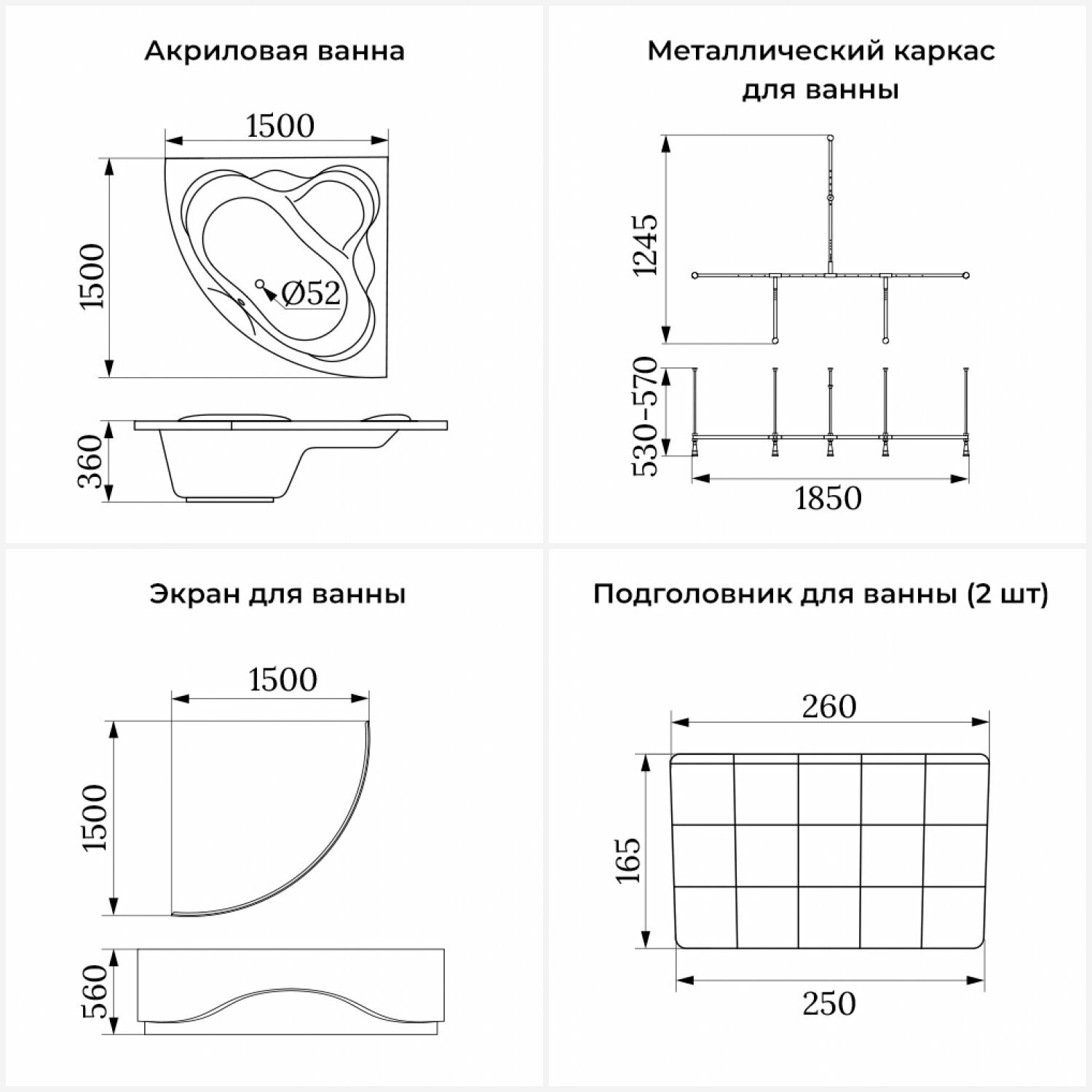 Акриловая ванна 150х150 см Lavinia Boho Elegant набор 4 в 1 S2-3705015P: угловая ванна, металлический каркас, подголовник, лицевой экран