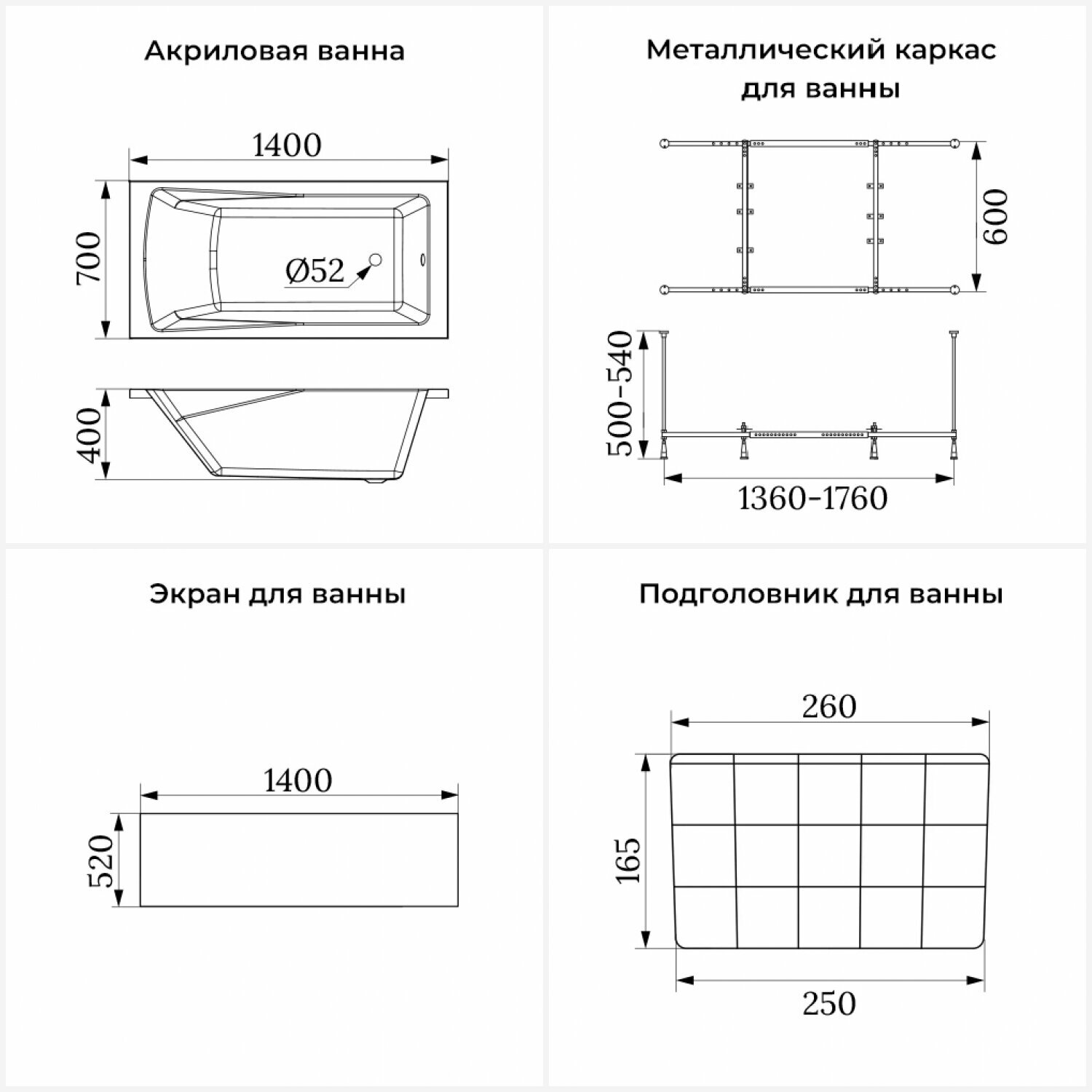 Ванна акриловая 140х70 Lavinia Boho One S2-3701004P в наборе 4 в 1: прямоугольная ванна 140 х 70 см, усиленный металлический каркас, мягкий подголовник, лицевой экран