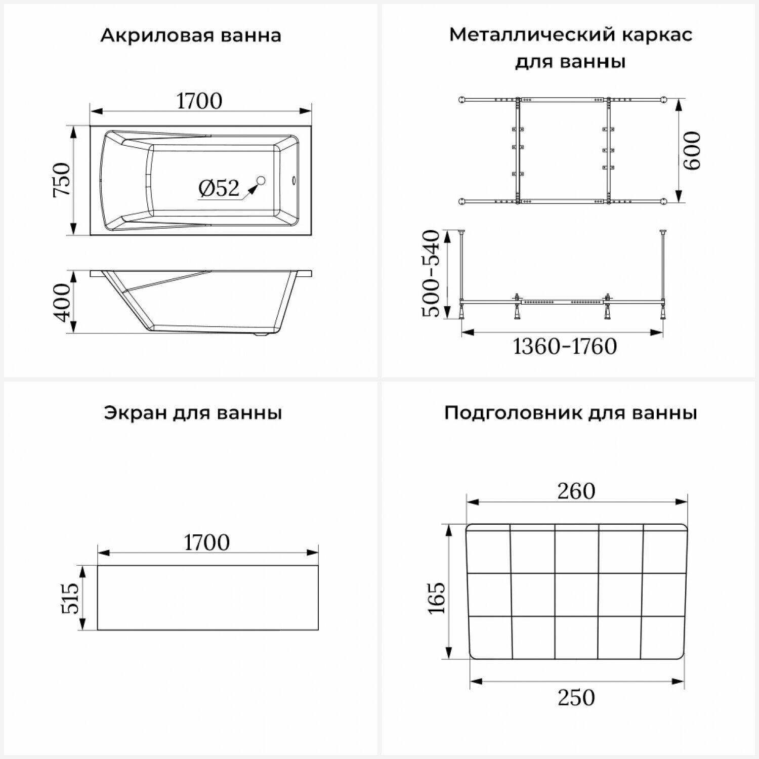 Акриловая ванна 170х70 см Lavinia Boho One набор 4 в 1 S2-3701007P: прямоугольная ванна, металлический каркас, подголовник, лицевой экран