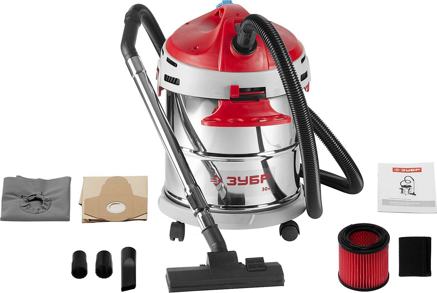 Пылесос строительный, ЗУБР ПУ-30-1400 М3, модель М3-30, 30 л, 1400 Вт, сухая и влажная уборка, корпус из нержавеющей стали, розетка до 2000Вт