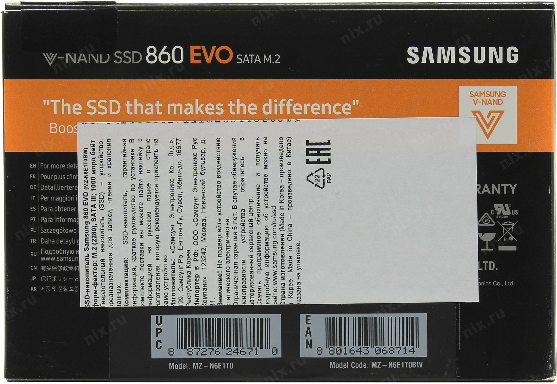 SSD диск Samsung M.2 860 EVO 1000 Гб M.2 2280 Sata III V-nand 3bit MLC Mz-n6e1t0bw