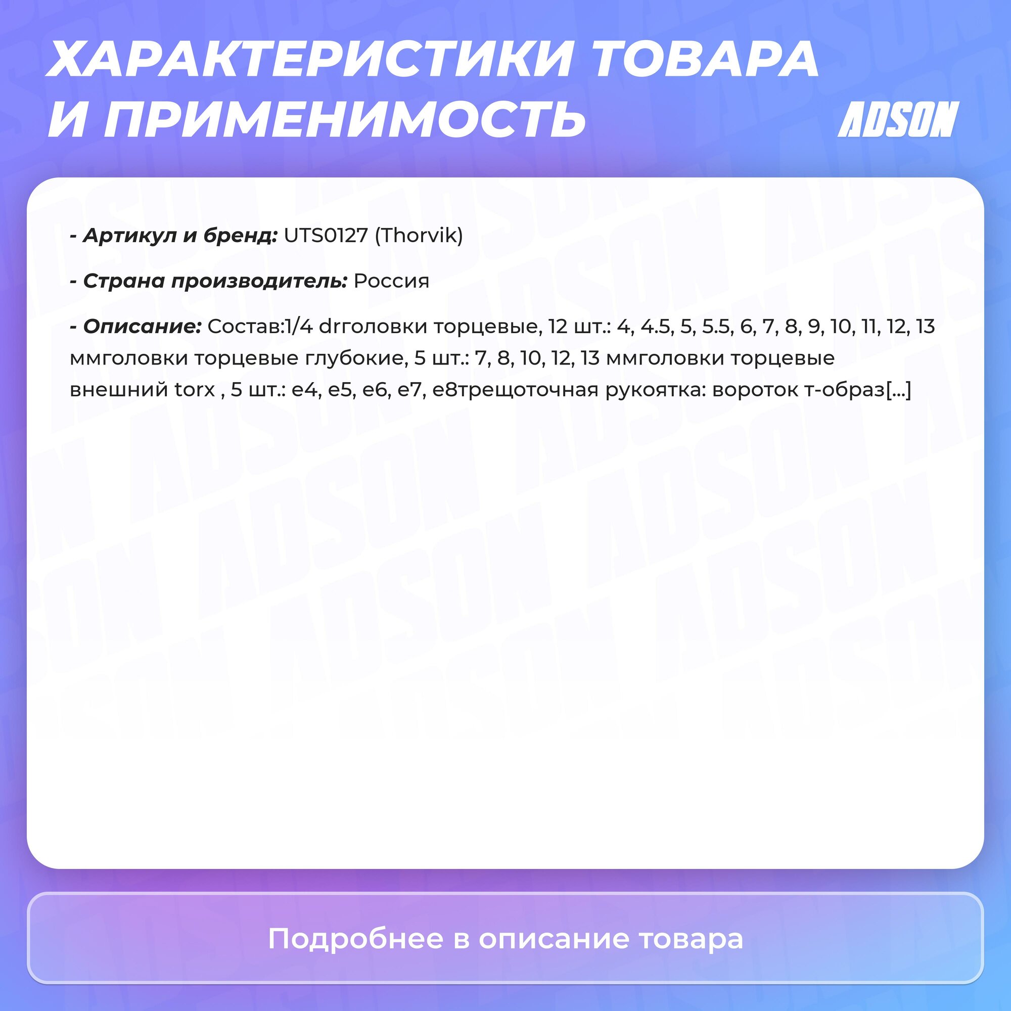 | Головки торцевые подробно | 1/4": 4, 4.5, 5, 5.5, 6, 7, 8, 9, 10, 11, 12, 13 мм; глубокие: 7, 8, 10, 12, 13 мм; со вставкой: Е4, Е5, Е6, Е7, Е8; 1/2": 8, 9, 10, 11, 12, 13, 14, 15, 16, 17, 18, 19, 21, 22, 24, 27, 30, 32 мм; глубокие: 10, 12, 13, 14, 15, 17, 19 мм; свечные: 16, 21 мм; со вставкой: Е10, Е12, Е14, Е16, Е18, E20, E22, E24; 1/4'': трещоточная рукоятка, вороток Т-образный, шарнир карданный, удлинитель 75 мм, удлинители с шаром - 50, 150 мм, гибкий удлинитель 150 мм; 1/2'': трещоточная рукоятка, вороток Т-образный 250 мм, вороток гибкая рукоятка 380 мм, шарнир карданный, удлинители - 125, 250 мм, удлинитель с шаром 50 мм |