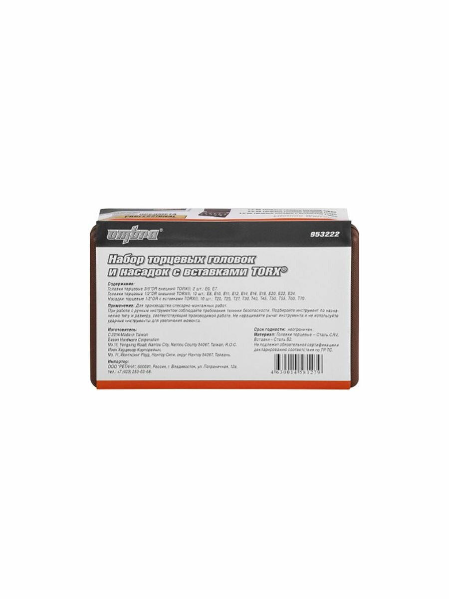 | Подробная комплектация | головки торцевые 3/8" DR внешний TORX - E6, E7; головки торцевые 1/2" DR внешний TORX - E8, E10, E11, E12, E14, E16, E18, E20, E22, E24; насадки торцевые 1/2" DR со вставками-битами TORX - T20, T25, T27, T30, T40, T45, T50, T55, T60, T70 |