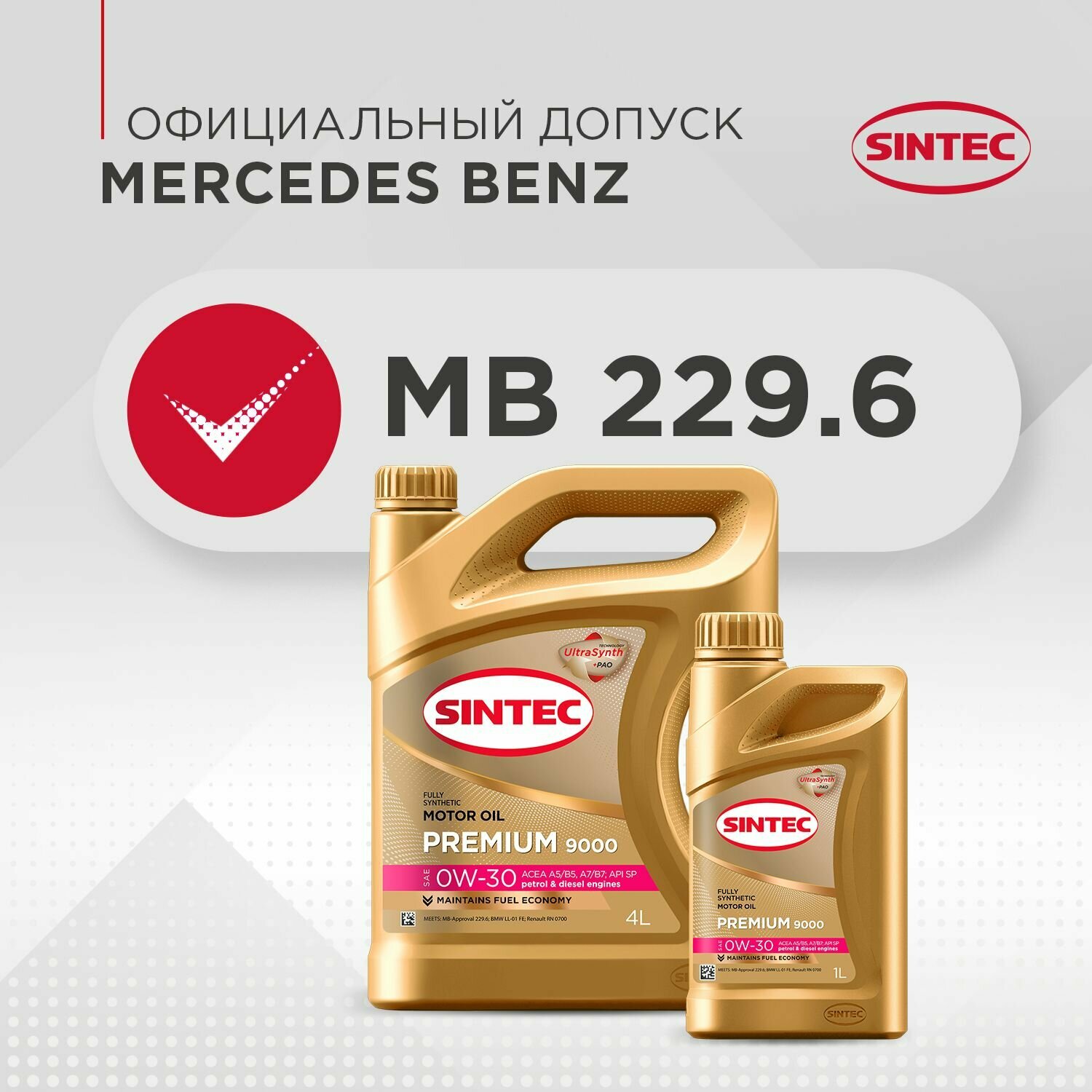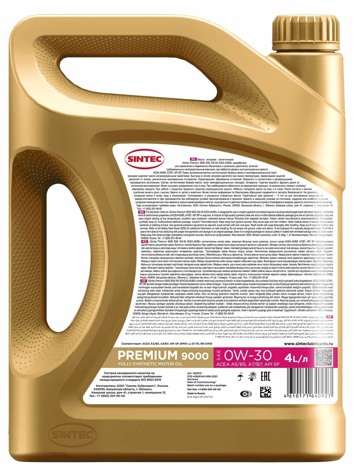 Sintec PREMIUM 9000 SAE 0W-30 API SP/CF, ACEA A5/B5 4л синтетика (600115)