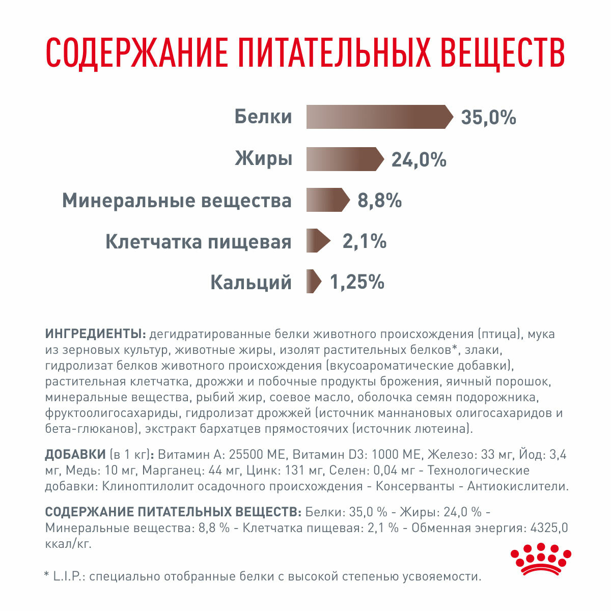 | Состав | дегидратированные белки животного происхождения (птица), мука из зерновых культур, животные жиры, изолят растительных белков*, злаки, гидролизат белков животного происхождения (вкусоароматические добавки), растительная клетчатка, дрожжи и побочные продукты брожения, яичный порошок, минеральные вещества, рыбий жир, соевое масло, оболочка и семена подорожника, фруктоолигосахариды, гидролизат дрожжей (источник мaннановых олигосахаридов и бета-глюканов), экстракт бархатцев прямостоячих (источник лютеина) |