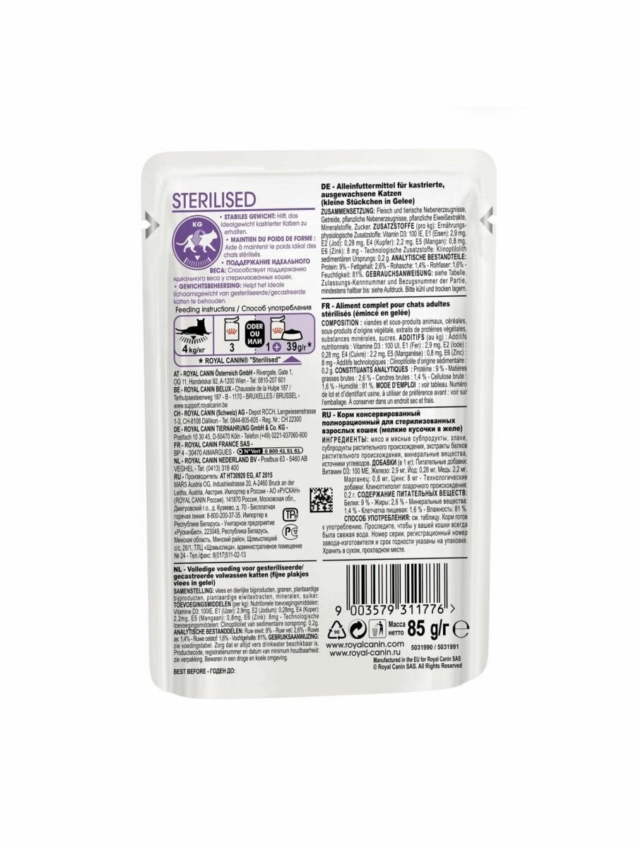 Влажный корм RC Sterilised для стерилизованных кошек, в желе, пауч, 85 г(28 шт.)