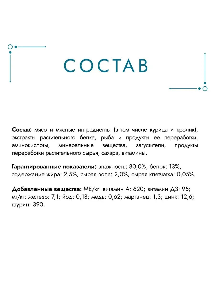 | Состав | мясо и мясные ингредиенты (в том числе курица и кролик), экстракты растительного белка, рыба и продукты ее переработки, аминокислоты, минеральные вещества, загустители, продукты переработки растительного сырья, сахара, витамины |