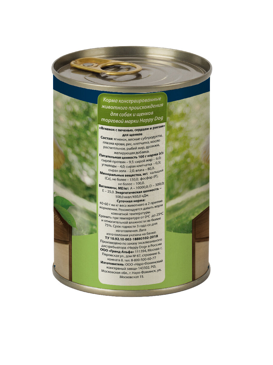 Консервы Happy Dog для щенков, ягненок с печенью, сердцем и рисом 410г х 12шт