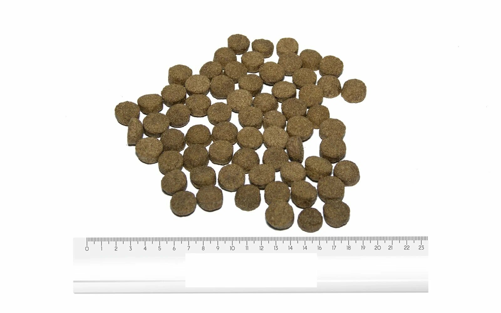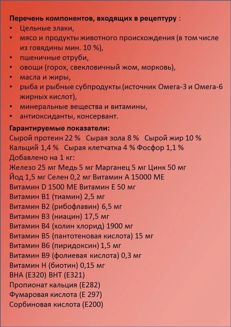 | Состав | цельные злаки, мясо и продукты животного происхождения (в том числе из говядины мин. 10 %), пшеничные отруби, овощи (горох, свекловичный жом, морковь), масла и жиры, рыба и рыбные субпродукты (источник Омега-3 и Омега-6 жирных кислот), минеральные вещества и витамины, антиоксиданты, консервант |