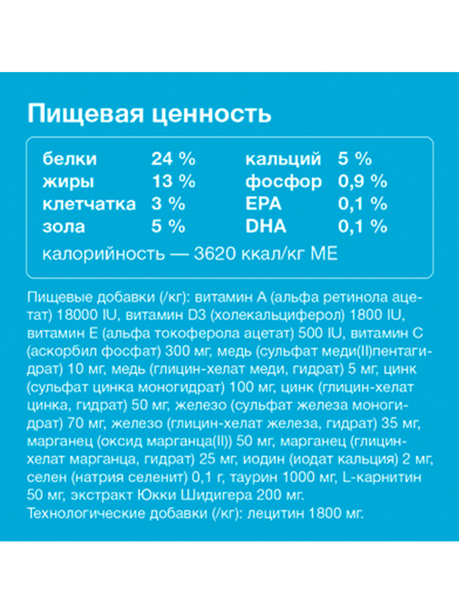 | Минеральные вещества | медь (сульфат меди (II) пентагидрат) 5,0 мг/кг, цинк (cульфат цинка моногидрат) 65 мг/кг, железо (сульфат железа моногидрат) 50 мг/кг, марганец (оксид марганца (II)) 35 мг/кг, йодин (йодат кальция) 1.5 мг/кг, таурин - 100 мг/кг, L-карнитин - 300 мг/кг, лецитин - 4000 мг/кг. |