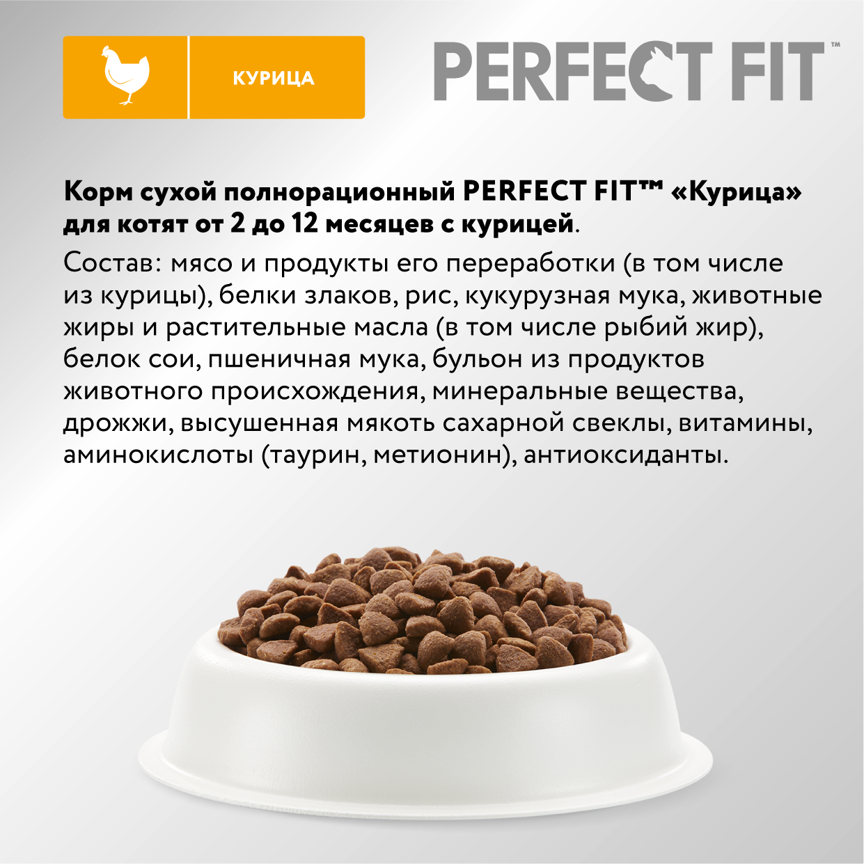 Cухой полнорационный корм PERFECT FIT™ для котят от 2 до 12 месяцев, с курицей, 1.2кг