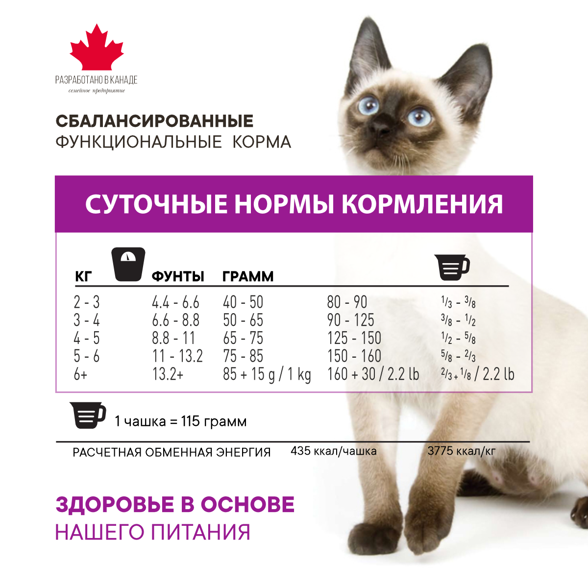 | Дозировка | - вес кошки 2-3 кг - 40-50 г - вес кошки 3-4 кг - 50-65 г - вес кошки 4-5 кг - 65-75 г - вес кошки 5-6 кг - 75-85 г - вес кошки 6+ кг - 85 + 15 г/кг |