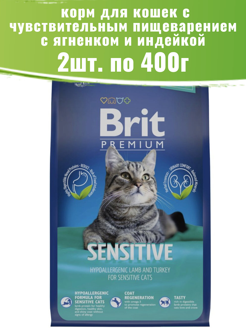 Корм для кошек сухой Брит Premium Cat Sensitive для взрослых животных с чувствительным пищеварением гранулы с индейкой и ягненком 400г / кошачья еда