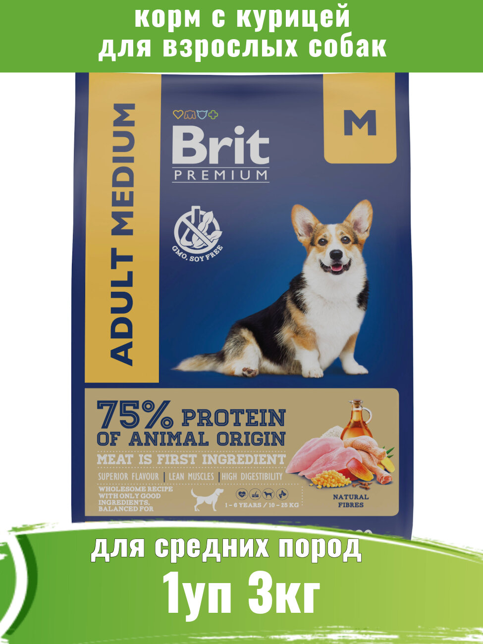 Brit Premium Dog Adult Medium корм сухой для взрослых собак с курицей 1шт - 3кг