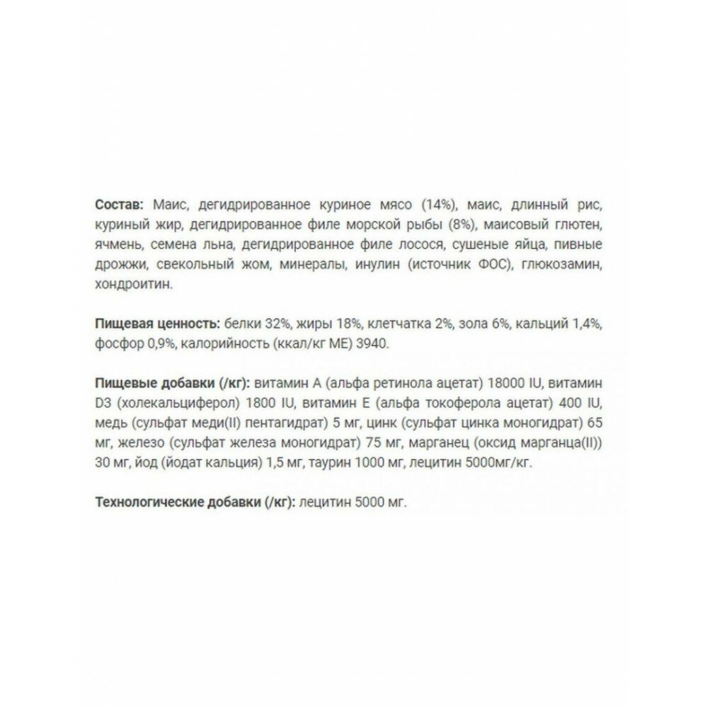 | Состав | Маис, дегидрированное куриное мясо (14%), маис, длинный рис, куриный жир, дегидрированное филе морской рыбы (8%), маисовый глютен, ячмень, семена льна, дегидрированное филе лосося, сушеные яйца, пивные дрожжи, свекольный жом, минералы, инулин (источник ФОС), глюкозамин, хондроитин |
