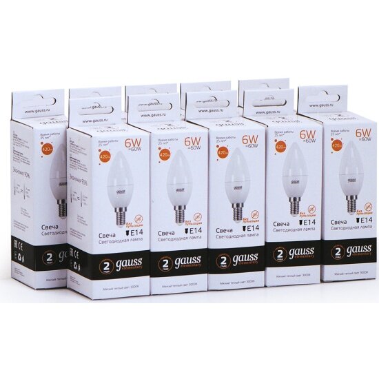 (12 шт.) Светодиодная лампочка Gauss Candle С37 6Вт 150-265В 3000К/2700K E14