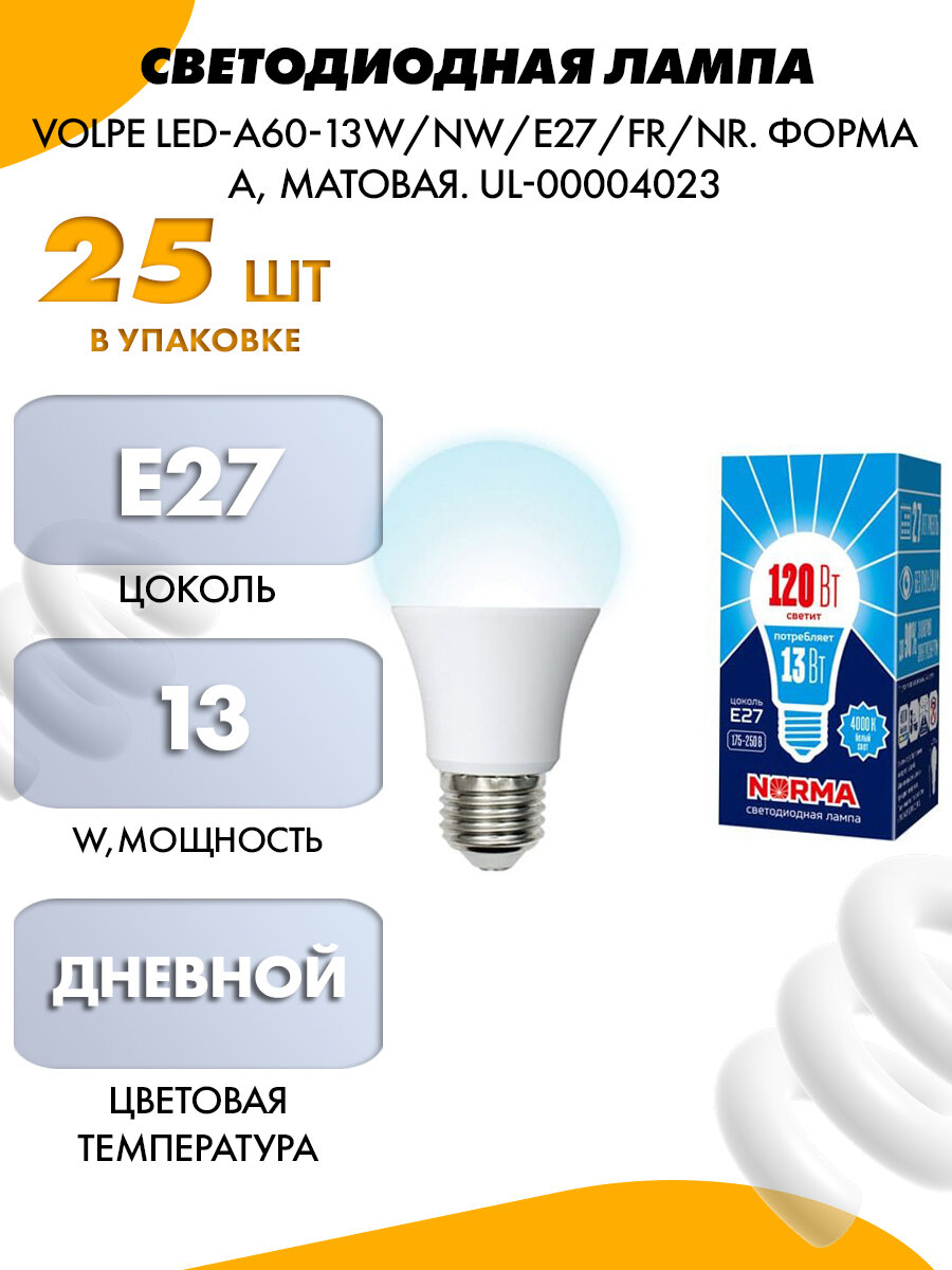 Купить светодиодная лампа шар A60 Белый дневной 13W UL-00004023 LED-A60-13W/NW/E27/FR/NR Norma Volpe