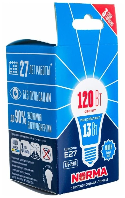 | Эквивалент лампы накаливания | 60 Вт |