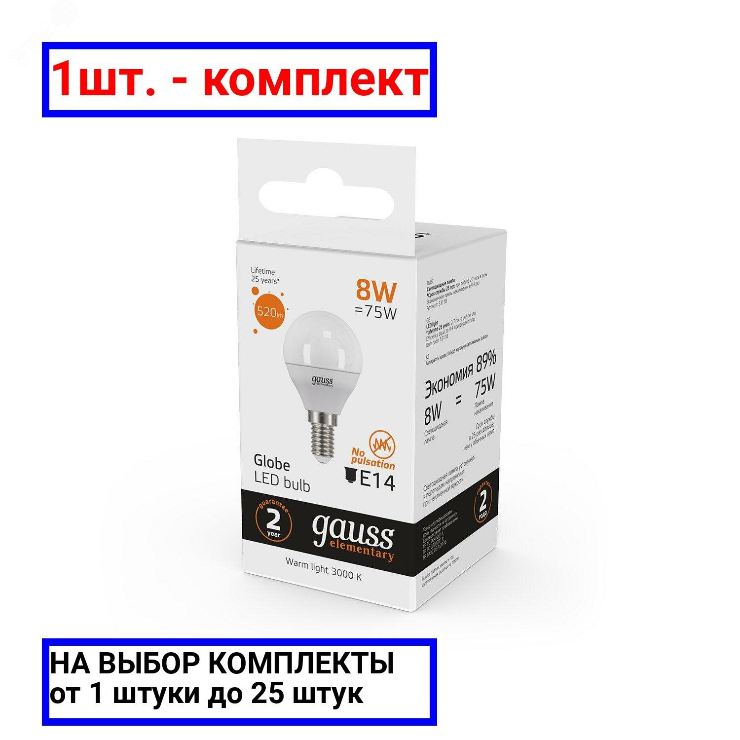 (2 шт)Лампа Gauss Elementary Шар 8W 520lm 3000K Е14 LED 1/10/100