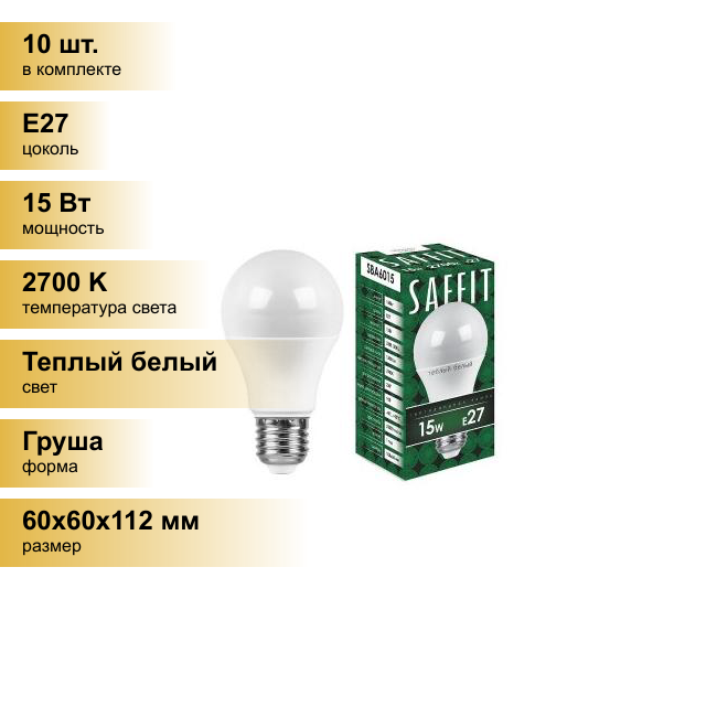 (10 шт.) Светодиодная лампочка Saffit ЛОН А60 E27 15W(1500Lm) 2700K 2K матовая 112x60 SBA6015 55010 Теплый белый. Цоколь E27
