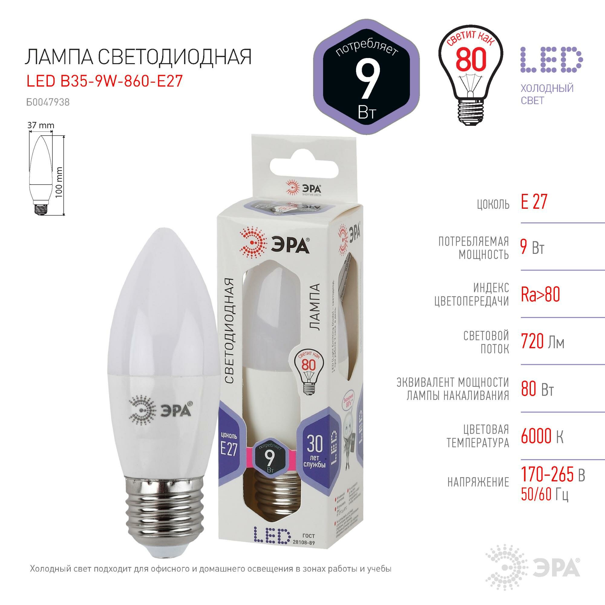Лампа светодиодная ЭРА STD, 9 (80) Вт, цоколь E27, свеча, холодный белый свет, 35000 ч, LED B35-9W-860-E27, Б0031410