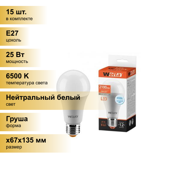 Купить (15 шт.) Светодиодная лампочка Wolta лампа св/д ЛОН A67 E27 25W(2100Lm) 6500K 6K 138x67x67 матовая 25W67BL25E27 Нейтральный белый. Цоколь E27
