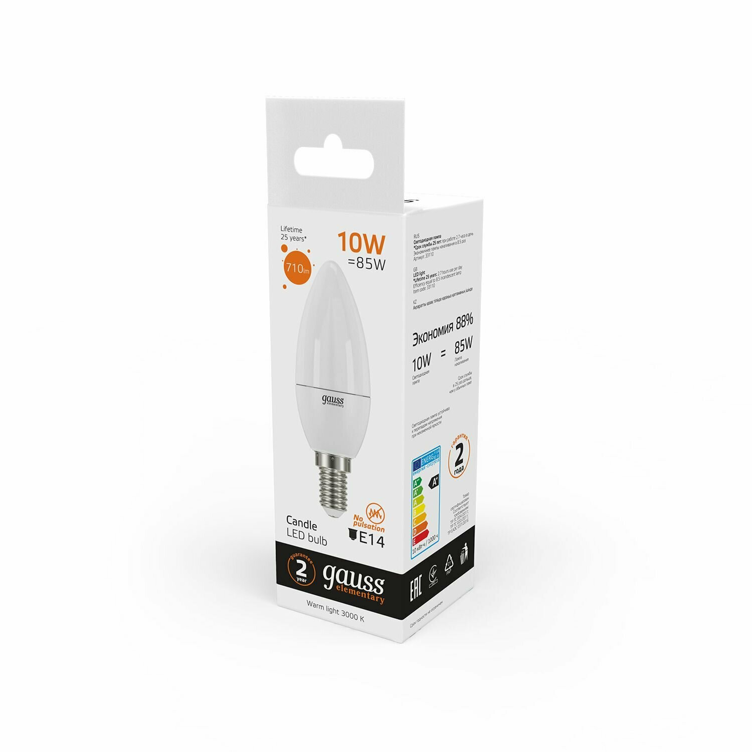 (10 шт)Лампа Gauss Elementary Свеча 10W 710lm 3000K Е14 LED 1/10/100