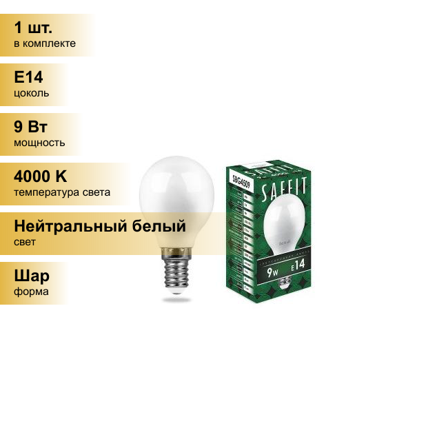 Лампа светодиодная E14, 9 Вт, 90 Вт, 230 В, шар, 4000 К, свет белый, Saffit, SBG4509, G45, 55081