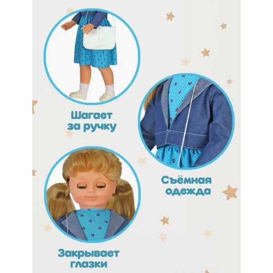 | Плюсы: | Большая кукла, в реальности она красивее, дочери очень понравилась, ходит за руку. Дочь ее посадила, потом снова с ней пошла, ходит |