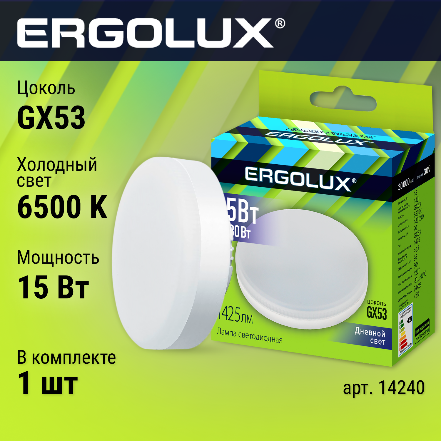 Светодиодная лампочка Ergolux, 15 Ватт, GX53, 6500 К, холодный белый свет