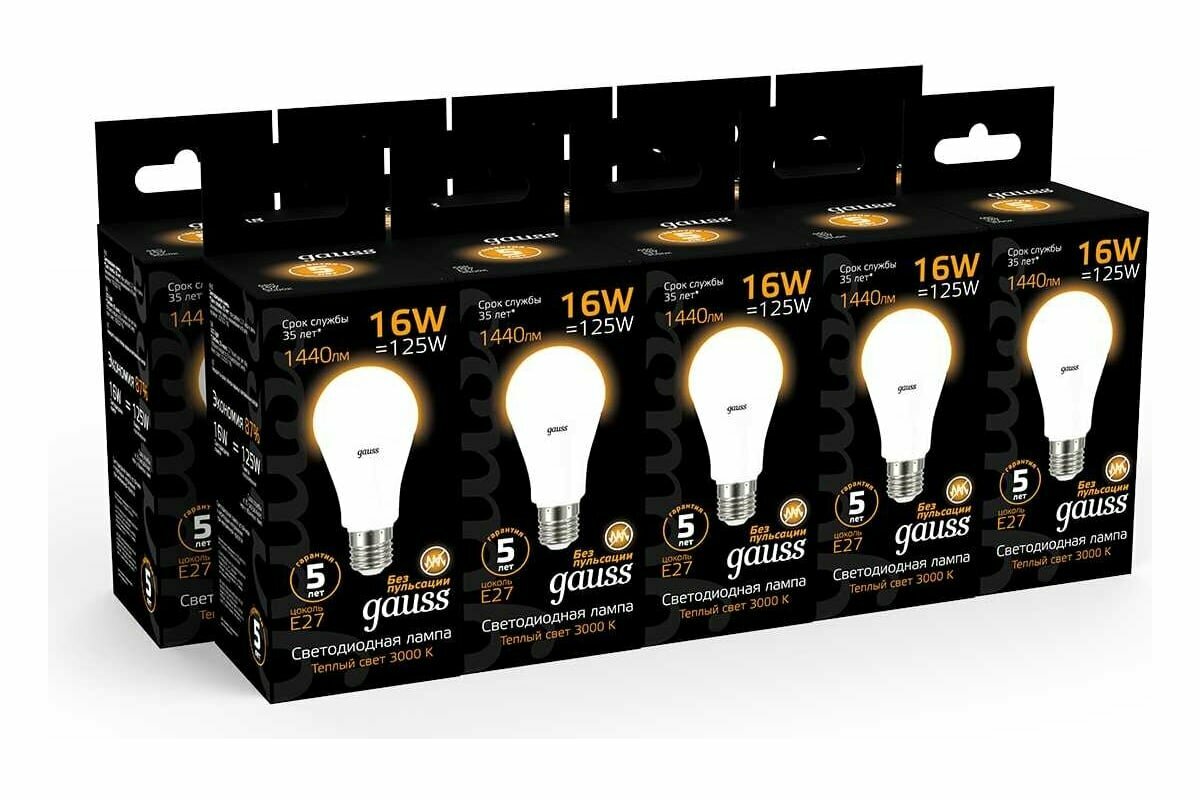 (5 шт)Лампа Gauss A60 16W 1440lm 3000K E27 LED