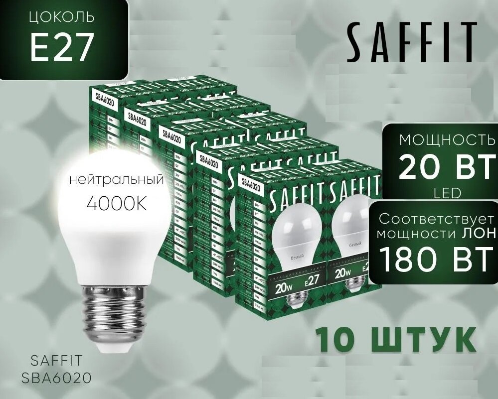 Лампа светодиодная SBA6020 Шар E27 20W 4000K, SAFFIT 55014 (1 шт.)