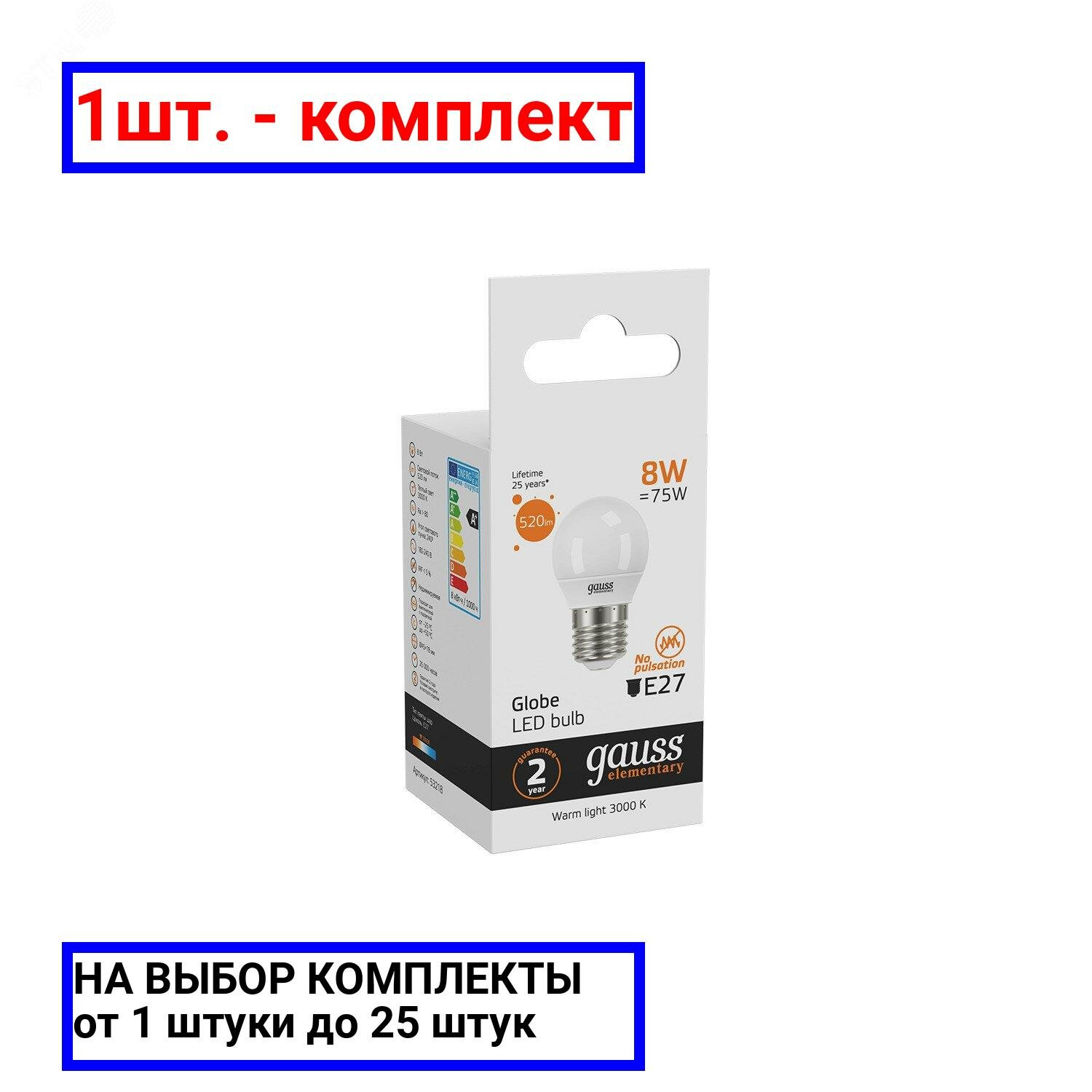 (10 шт)Лампа Gauss Elementary Шар 8W 520lm 3000K Е27 LED 1/10/100