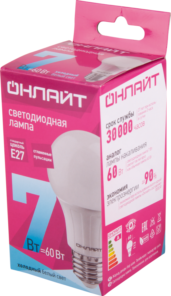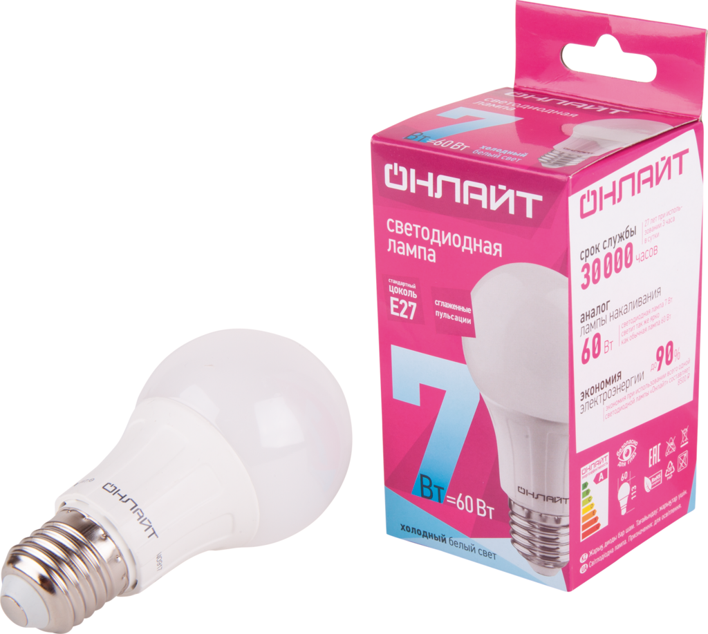 Лампа светодиодная LED Онлайт, E27, A60, 7 Вт, 4000 K, холодный свет