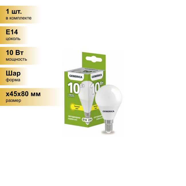 Лампочка светодиодная GENERICA Е14 10Вт=100Вт 230В 3000К теплый свет шар (комплект из 10 шт.)