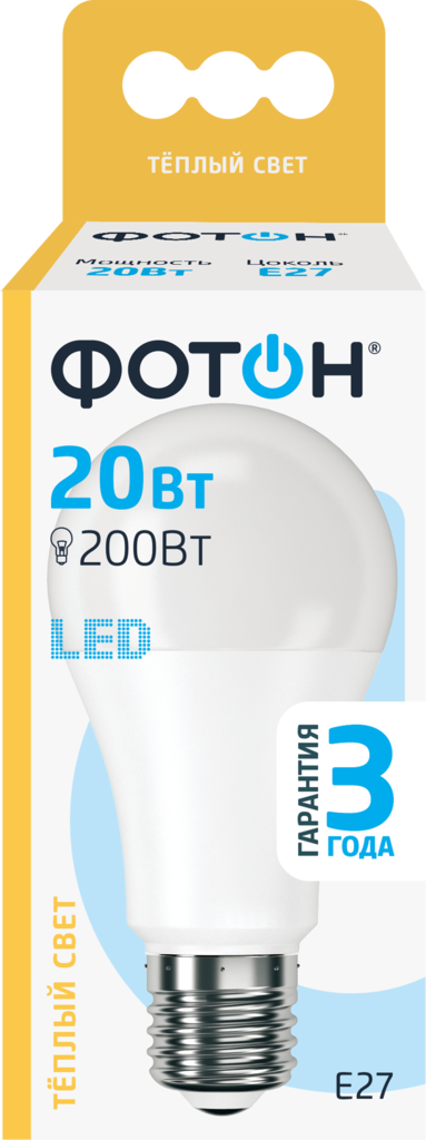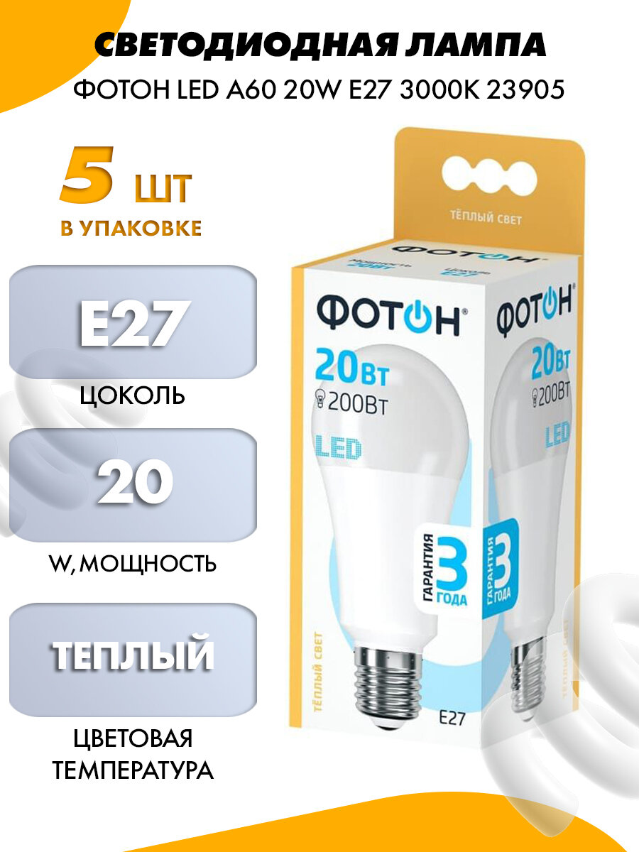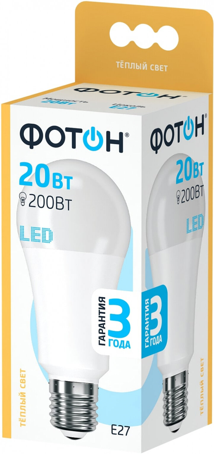 Лампа светодиодная фотон 23905, E27, A60, 20 Вт, 3000 К