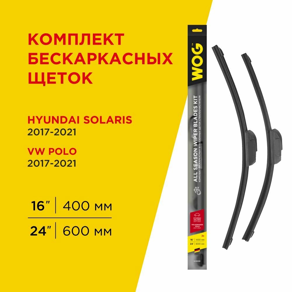 Комплект щеток стеклоочистителя, дворники автомобильные бескаркасные 600 мм/24"+400 мм/16" (HYUNDAI SOLARIS/Volkswagen POLO) с креплением "HOOK" WOG, 2 шт.