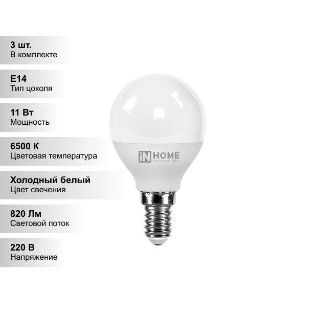 Купить (3 шт.) Лампа светодиодная LED-ШАР-VC 11Вт 230В Е14 6500К 820Лм IN HOME