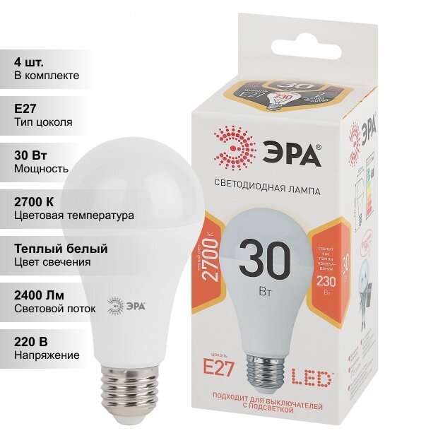 Купить (4 шт.) Светодиодная лампочка ЭРА LED A65-30W-827-E27