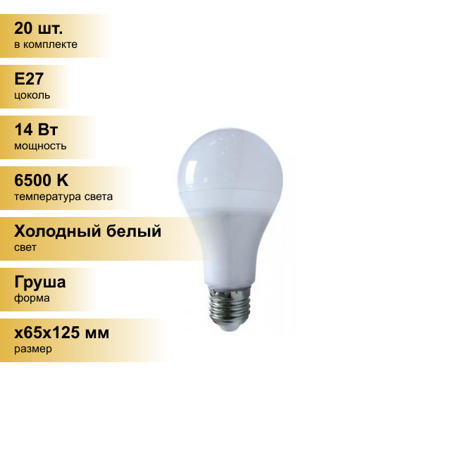 Сохранить(20 шт.) Светодиодная лампочка Ecola ЛОН A65 E27 14W 6500K 6K 125x65 360° Premium K7SD14ELB Холодный белый. Цоколь E27 интересное: