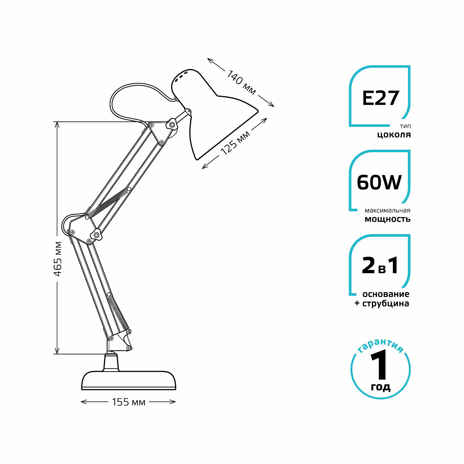 Настольная лампа GAUSS GTL002 60W 220-240V E27 черный струбцина и основание 1/12
