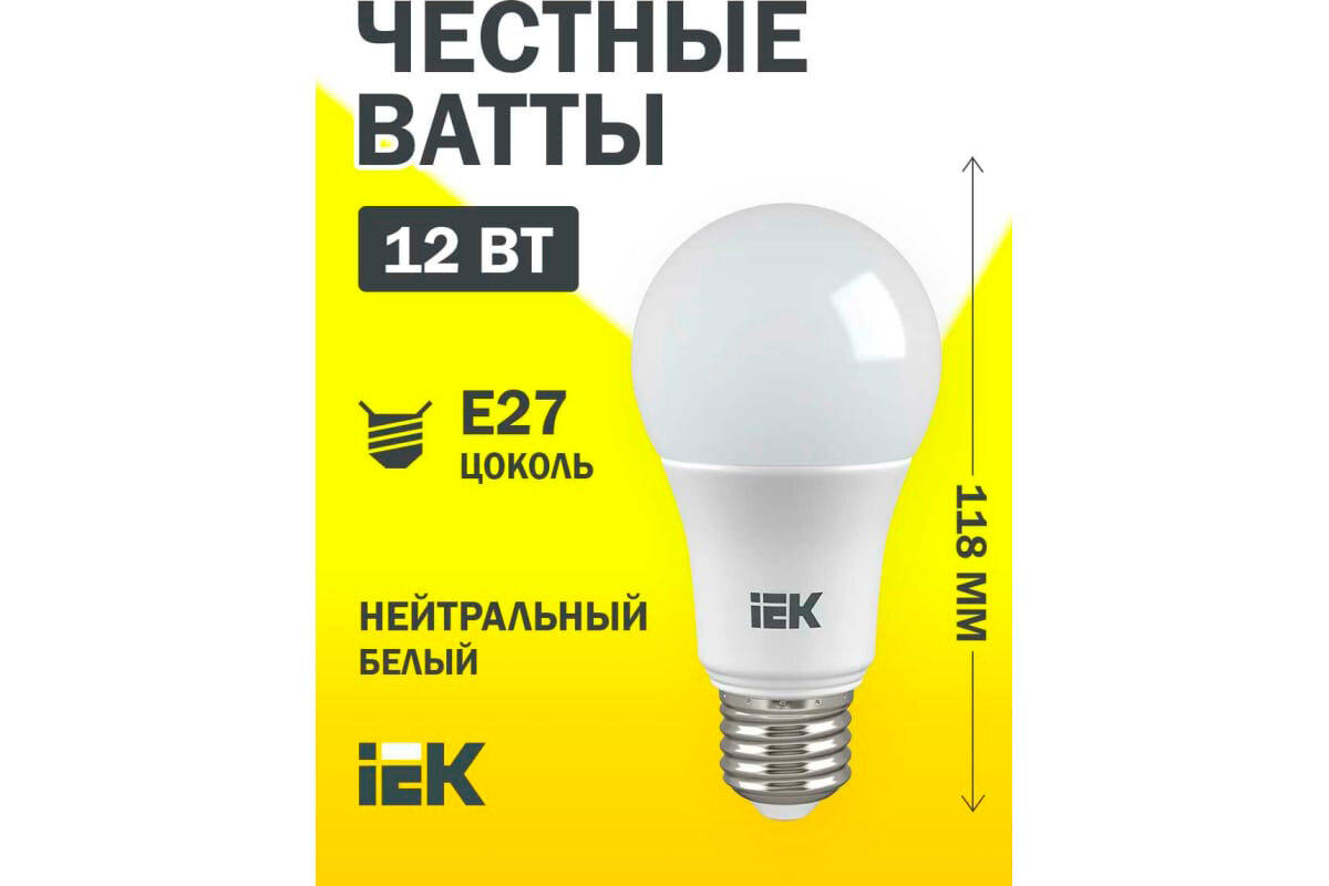 Лампа светодиодная IEK ECO 4000K, E27, A60, 12 Вт, 4000 К