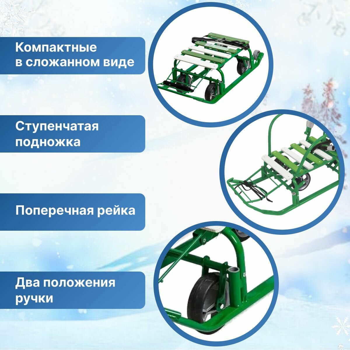 | Плюсы: | Отличные санки, легко вытаскиваются и убираются колеса.