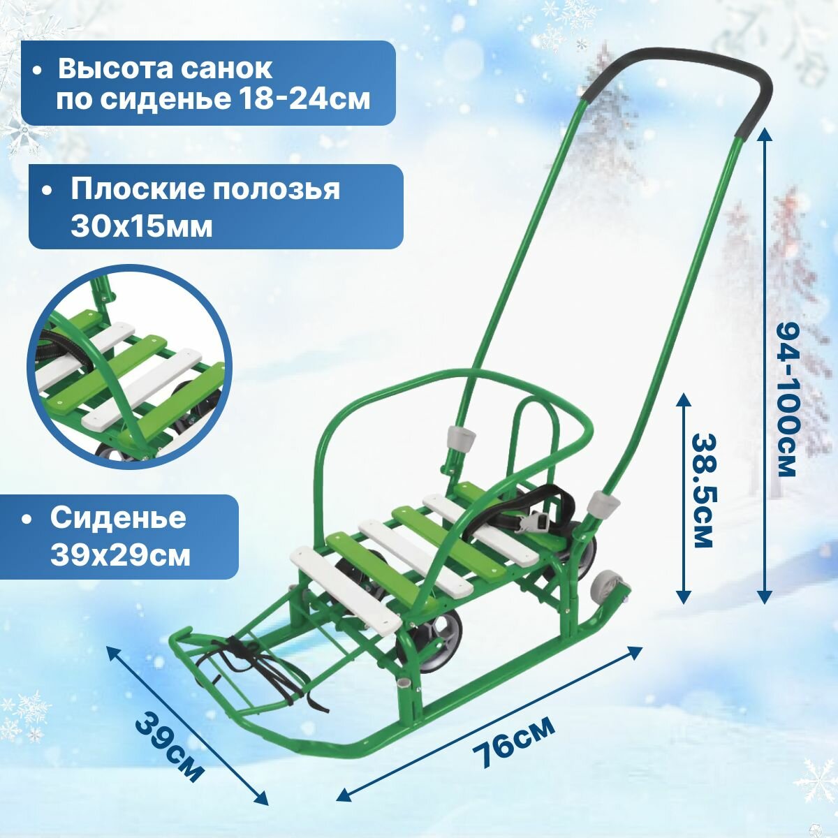 | Плюсы: | Очень удобные большие санки, Есть ремень безопасности, подставки под ноги. |
