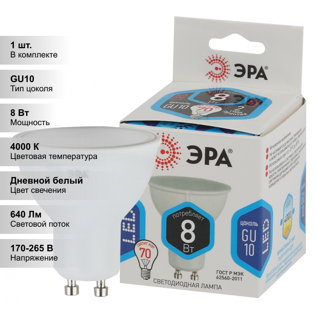 Лампа светодиодная LED MR16-8W-840-GU10 8Вт MR16 софит 4000К нейтр. бел. GU10 Эра, ЭРА Б0036729 (1 шт.)