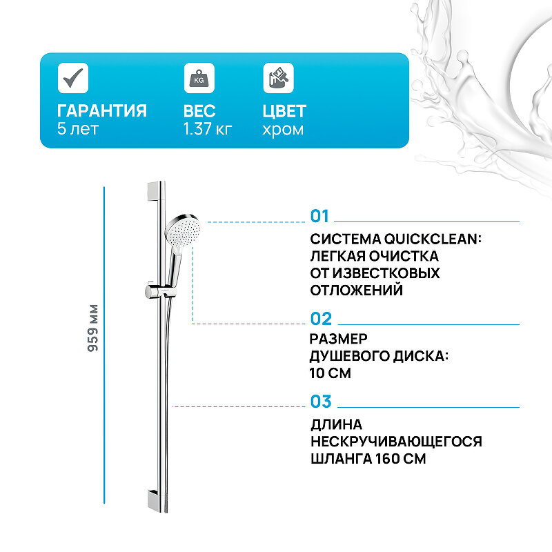 | Дополнительная информация | высота стойки для душа: 959 мм; диаметр душевой лейки: 100 мм |