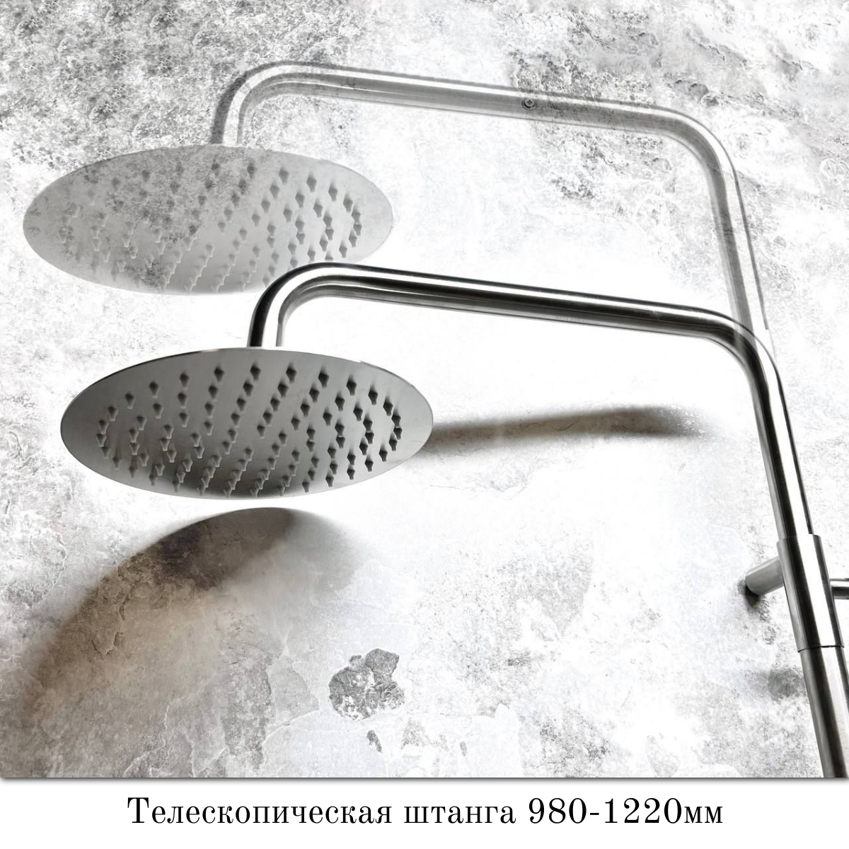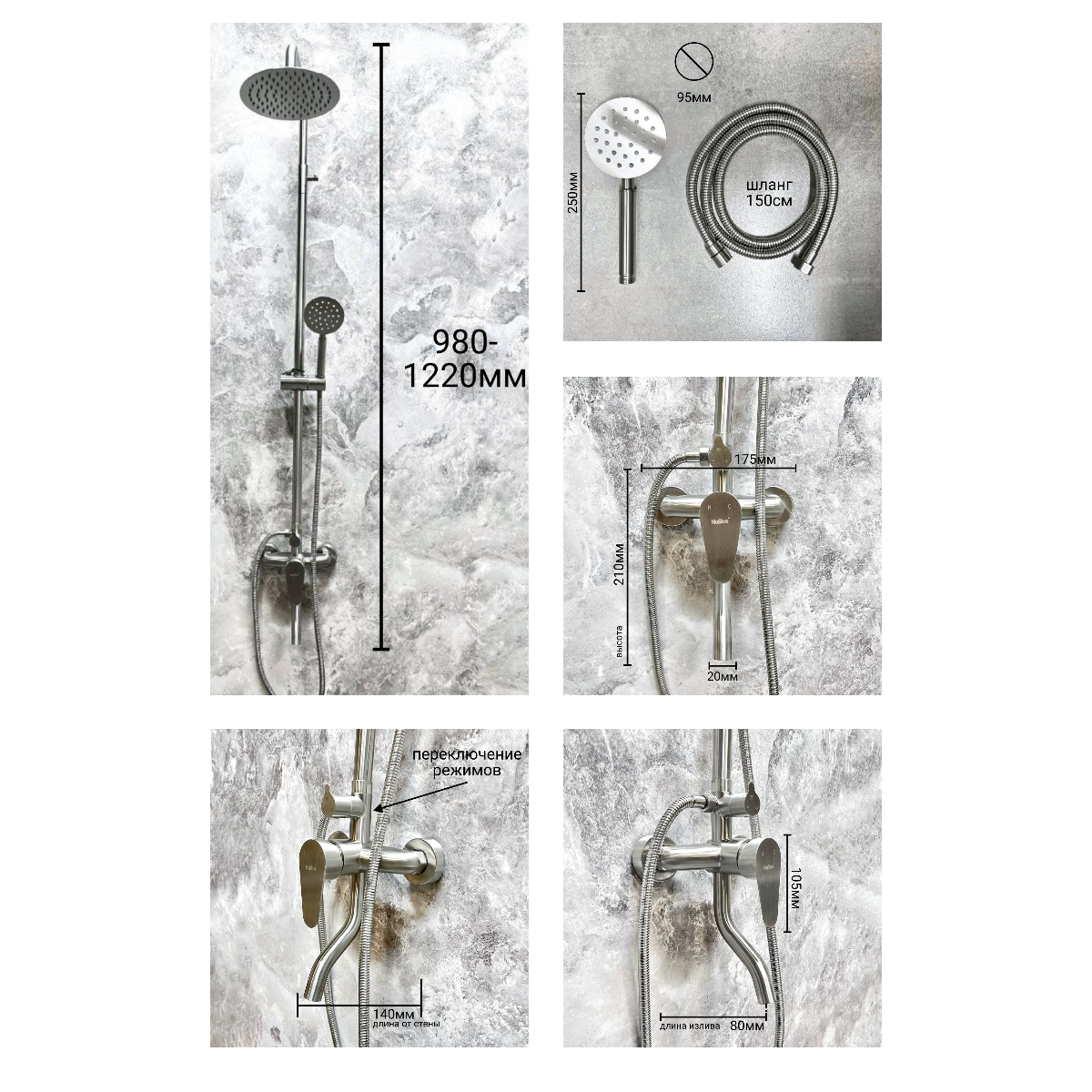 | Комплектация | Смеситель / душевая стойка / крепления / душевая лейка / держатель лейки / тропический душ / Душевой шланг 150 см / эксцентрики / отражатели |