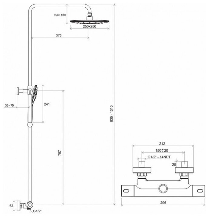 | Дополнительная информация | высота стойки для душа: 1295 мм; длина верхнего душа: 250 мм; ширина верхнего душа: 250 мм |
